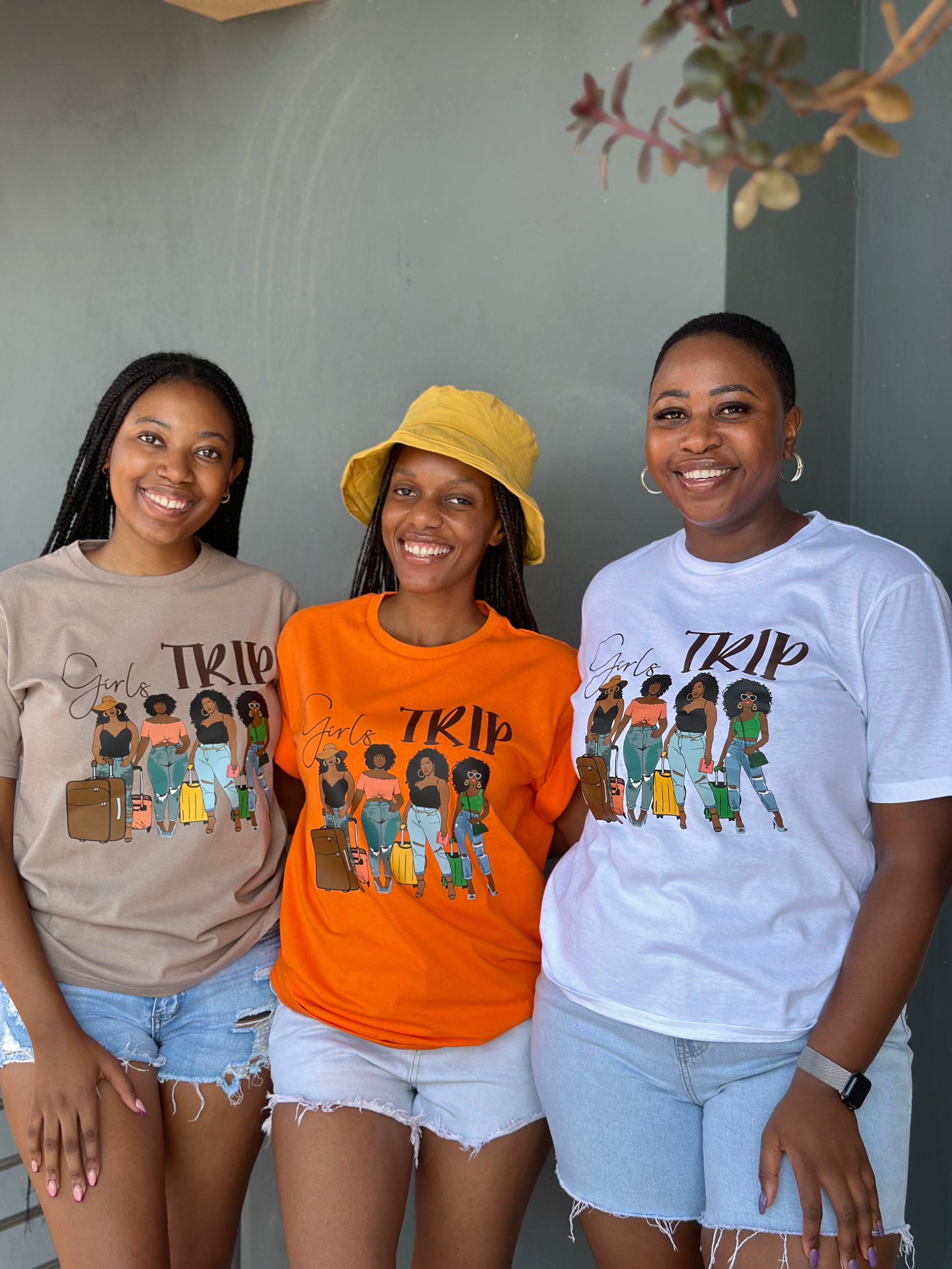 in style with our Girls' Trip Tees! 🌴👯♀️ Unleash your squad's sass with these matching shirts – because every great trip needs a little twinning magic! Get ready for laughter, memories, and a whole lot of fun.